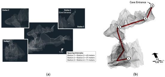 Illustrations showing the Muang-On Cave model with the positions of the four IoT stations. (a) Mappings show the positions of each station with spacing intervals of 43, 31, and 11 m for the distance between Stations 1 and 2, Stations 2 and 3, and Stations 3 and 4, respectively. (b) The perspective view of the model exhibits a red survey line drawn from the innermost station to the cave entrance station. The line is a total of 85 m in length.