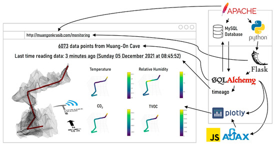 The working relationships between the coding packages and the database via the web application are presented in Figure 9. Starting with Apache2, it represents a web server operation hosting the MySQL database and the Python package library. Flask controls web access channels and utilizes the SQLAlchemy package to connect, commit, and receive all data from the database. Timeago is responsible for converting timestamp data into humanized text datetime data for display via the web application. Plotly receives the monitoring data from SQLAlchemy and subsequently generates a three-dimensional interactive map. Ultimately, AJAX produces steady updates of the displayed data on the Plotly.