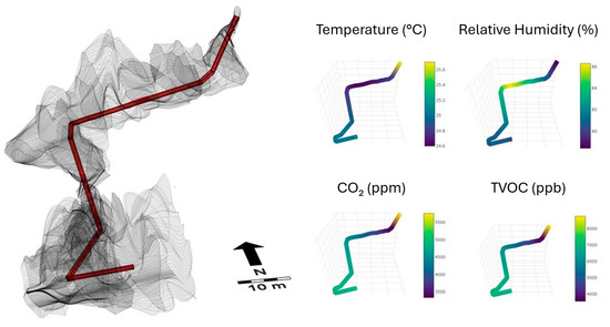 The data display of the IoT system on the web application, showing the cave 3D model associated with the survey line, orientation, the weather data received from four stations, and the scales. The data include temperature (°C), relative humidity (%), CO2 (ppm), and TVOCs (ppb).