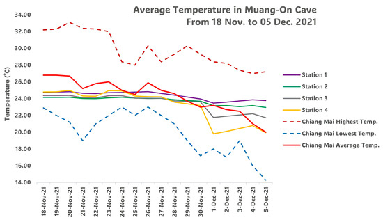 Since the IoT system was tested in late November to early December, it fully experienced a transition from the wet season to the dry season in northern Thailand. This affects the dynamic temperature and humidity data collected in the cave. Daily average temperature and relative humidity data in the cave are presented in Figure 11 and Figure 12, respectively, with comparisons to the outdoor weather data of Chiang Mai in the same period.