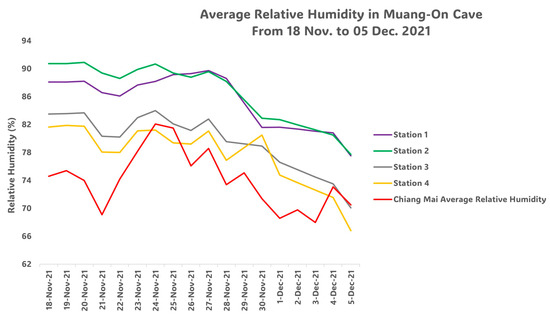 Average relative humidity comparisons between the inside and the outside of the cave. Similarly to Figure 11, the relative humidity trends in the cave are divided into four lines indicating the four IoT stations. The humidity of all stations in the cave is relatively high compared to the outside.