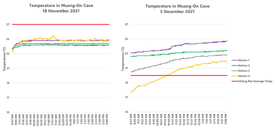 Daily temperature comparisons between the first day (left) and the last day (right) of the testing period. The first day likely indicates the wet season, whereas the final day indicates the dry season. The in-cave temperatures from all stations measured in the representative wet season are near steady and lower than the average outdoor temperature. The dry season, on the other hand, results in a rising trend of all-station temperatures in the cave. The weather is apparently warm in the cave during the dry season.