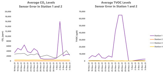 The CCS811 sensor errors that occurred at Stations 1 and 2 are possibly related to extremely high relative humidity in the air. Station 1 distinctly shows a very high humidity of 85%. Station 2, unsurprisingly, shows 90% humidity. It is also known that a humidity level exceeding 85% is considered a harsh environmental condition for sensor operation [56]. In addition, the specification of the CCS811 sensor provides a preferred humidity range of working conditions to be no greater than 95%. Stations 3 and 4 have no issues since their relative humidity ranges from 78 to 82%. This study highly agrees that the consideration of other CO2 and TVOC measuring methods, such as a nondispersive infrared sensor (NDIR sensor), should be an interesting alternative to simply avoid the errors.