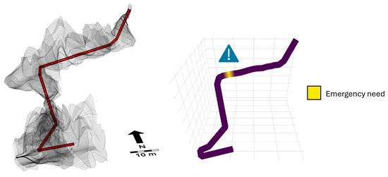 Besides the weather monitoring, this study tested the rescue request commands, emergency detection, and notification of all IoT stations in the cave. Similarly to the working procedures of the weather data, each station detects a signal generated by a user manually every 80 to 110 s. The received signal is then encoded into text and interpreted as a rescue requirement. The location of the signal source can be determined through the chain-like text package and simultaneously displayed via the web application (Figure 15). If no emergency signal is generated, a default value of 1 is always replaced, which stands for no emergency currently needed.