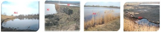 The storage facilities of chemical enterprises contain wastewater with many different components. They contain insoluble impurities, suspensions, and dissolved substances of a mineral and organic nature (surfactants, oxidants, and dyes) and have a specific color and medium acidity (pH) from 4 to 12.5 []. The modern organic and organometallic dyes which are produced by the “Rubizhansky Krasitel” enterprise (Rubizhne, Luhansk region, Ukraine) have a low capacity for biodegradation, as well as resistance to the chemical and temperature effects of the environment []. For many years, the waste from this enterprise, which produces dyes, bleaches, synthetic resins, plant protection products, plasticizers, and pigments, was discharged into the wastewater reservoir “Rubizhanskyi” (Figure 1). There have been different degrees of human-made impact on the nearby area because of the tailing storage facility (TSF) “Rubizhansky Krasitel” situated close to 1 km from the Siverskyi Donets River and 1.3–3.4 m from groundwater level. Up to 1.7 million m3 of waste have been produced, consisting of 34 types of chemical products []. An analysis of the salt composition of the Siverskyi Donets River in 2019 showed that the water was dominated by sulfates, chlorides, hydrocarbonates, and some elements (Ni, Zn, Mn, Cu, Al, etc.); the water was quite mineralized []. Currently, the reservoir comprises heavily polluted, colored industrial wastewater containing aromatic sulfonic acids, nitrobenzene, chlorobenzene, phenol, and mineral salts. The phenol (carbolic acid or phenolic acid, C6H5OH) concentration exceeded the maximum permissible amount by 67–85 times, while aniline (benzenamine, C6H5NH2) exceeded the maximum permissible concentration by 19–22 times [].
