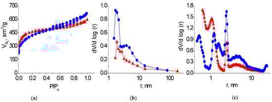 The nitrogen adsorption/desorption isotherms of the KARBON™ and ZL-302 carbon adsorbents belong to type I isotherms with a hysteresis loop of type H4 according to the IUPAC classification [] (Figure 3a). A sharp increase in the amount of absorbed nitrogen at low relative pressure and the presence of hysteresis loops on the isotherm at medium and high pressure indicate that these adsorbents are micro-mesoporous materials. It can be seen from the distribution curves of the pore volumes by size that carbon adsorbent KARBON™ contains micropores with a radii of 0.6−1.0 nm and mesopores with a radii of 1−1.5 and 2−3 nm. The number of mesopores of different sizes increases in the porous structure of the ZL-302 coal (Figure 3b,c; Table 1).