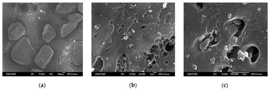 The morphology of the carbon sorbents KARBON™ and ZL-302 is presented in Figure 3. It can be seen from the SEM photographs that the carbon adsorbent KARBON™ has particles of irregular shape with a size of 0.2−0.4 mm (Figure 4a). At a magnification of 5000 and 25,000 times, surface transport pores are visible, the size of which depends on the bulk density of the KARBON™ adsorbent [] (Figure 4b,c).