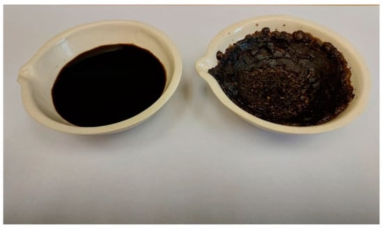 The wastewater from the “Rubizhanskyi” reservoir was thick, dark brown in color, and contained a large amount of suspended particles (Figure 5). The TOC content of the pretreatment waters was found to be 1130 ppm at a 1000-fold dilution. The total content of organic and inorganic substances in terms of dry residue was 98.5 g/L, while calcined residue (mineral substances) was 79.6 g/L. Thus, the content of organic substances was 18.9 g/L. The total alkalinity of the initial wastewater was 0.16 g-eq/g, and the content of hydrocarbon ions was 9.76 g/L, pH = 4.