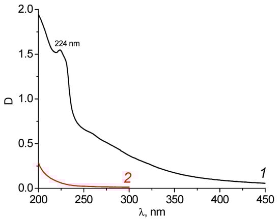 In the UV spectrum of the initial wastewater, a band with a maximum of 224 nm was observed (Figure 6, curve 1). This may indicate the presence of both aniline and phenol (maximum absorption of aniline at 234/288 nm, phenol at 210.5/270 nm; solvent water, pH = 3) [].
