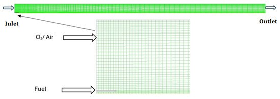 In this study, a simulation is performed of the combustion flame, and input values of different parameters are shown in Table 1. The diesel is represented by C10H22, having a C/H ratio very close to the investigational data. In the geometry of the model, the pre-evaporated is injected along the air through the inlet nozzle with the fuel inlet nozzle diameter of 5 mm, and the air enters the combustion zone by means of the nozzle (inlet air nozzle) having a diameter of 225 mm. Figure 1 illustrates the geometric schematic and highlights the locations of the air and fuel inlets.