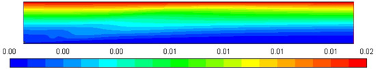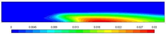 Figure 10 shows the soot formation during the combustion of diesel in a turbulent diffusion flame furnace, and the soot amount predicted through the Moss-Brooks model is 0.03. The shape of the soot mass fraction profile, as shown in Figure 10, is affected by the temperature and fuel concentration gradients within the combustion zone. The higher soot mass fraction near the center of the domain corresponds to regions of high temperature, where fuel pyrolysis and soot formation are most active. As the gas flows outward, the temperature decreases, which leads to a reduction in soot production, and hence, the soot mass fraction decreases. This behavior is characteristic of diffusion-controlled combustion, where soot formation is strongly coupled with local temperature and fuel concentration. The rapid drop in soot mass fraction at the periphery can also be attributed to the lower temperatures and reduced fuel availability in those regions, resulting in minimal soot formation.