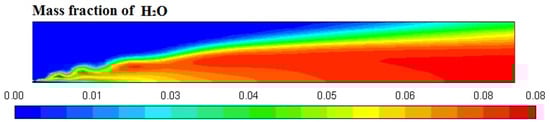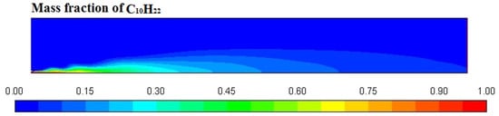 Figure 6, Figure 7, Figure 8 and Figure 9 represent the variation in mass fraction of diesel (C10H22), oxygen, CO2, and H2O, respectively. Diesel conversion takes place through combustion, so its mass fraction is reduced to zero. Similarly, the mass fraction of oxygen is also reduced to almost zero from 0.24. On the other hand, CO2 is formed by combustion reaction, so its mass fraction increases up to 0.24 as water is also formed in combustion, so the mass fraction H2O is also observed up to 0.08. A small amount of soot is also observed because of combustion reactions during diesel combustion.