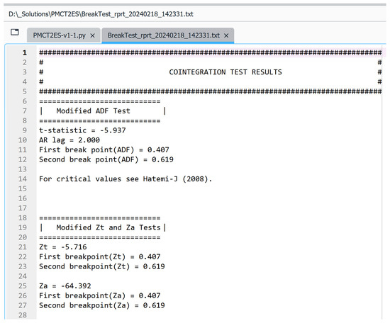 - Mustafa, A.; Hatemi-J, A. PMCT2ES: Python Module for Cointegration Tests with Two Endogenous Structural Shifts. Statistical Software Components, Nr. P00002, Boston College Department of Economics. 2022. Available online: https://ideas.repec.org/c/boc/bocode/p00002.html (accessed on 21 March 2024).