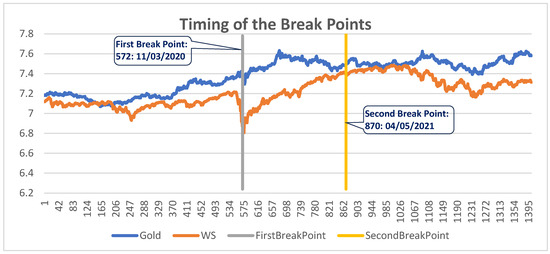 A view of data output for both break points in the form of a chart for both gold and World Stock Price Index.