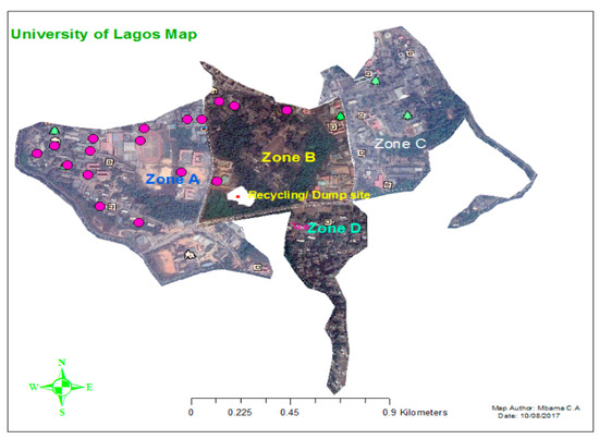 The University of Lagos (UoL) is one of Nigeria’s oldest universities and institutes of higher learning, with its establishment dating back to 1962. Mbama et al. [17] reported that the institution, with a daily population of approximately 87,000, generates an average of 32.2 tons of waste each day. The main campus in Akoka, in the western region of Lagos State, is divided into four distinct zones, labelled A–D (Figure 1); each zone contains administrative, commercial, and residential areas. The activities conducted in the administrative areas encompass both academic work and administrative office tasks. The commercial areas encompass various market venues, including restaurants, parking lots, places of worship, and copier shops. While within the residential areas, many activities occur, such as the presence of staff quarters and student dorms. The variety of ongoing on-campus activities result in the generation of a diverse range of waste types, but primarily similar in composition to municipal solid waste.