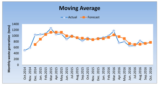 The UoL generates an average of 877.5 tons of waste every month, with the lowest recorded amount being 496.6 tons (October 2014) and the largest recorded amount being 1250.5 tons (March 2015). The moving average analysis indicates the existence of a noticeable seasonal pattern in the dataset, as can be seen in Figure 2. After conducting an analysis of the time series and trend at the University of Lagos (UoL), it has become abundantly clear that there is still a recurrent pattern in the generation of waste. There is a discernible pattern of recurrent negative cycles that exhibit seasonal fluctuations. The peak of this pattern is noticed in the month of March, which coincides with the first three months of the year. The month of June, and more specifically the latter half of the second quarter, is the month that achieves the lowest point as time progresses. The projection has the ability to extend to the generation for the year 2017, with the expectation that it will exhibit a pattern that is repeated.
