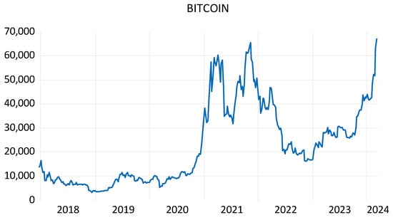 The empirical investigation is conducted by using weekly data for the exchange rate of Bitcoin versus the US dollar. Weekly data are used in order to avoid the weekend effect that can characterize the daily data. The sample period covers the last week of December 2017 until the first week of March 2024. The source of the data is Yahoo Finance. The data are transformed into positive and negative components via the solutions presented in Equations (4) and (5). It should be mentioned that only a drift was needed for the transformation without the time trend based on the visual inspection of the time path, and the exchange rate for Bitcoin presented in Figure 1.