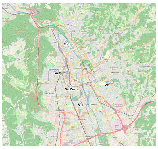 A city map of Graz with the five measurement sites marked [11].
