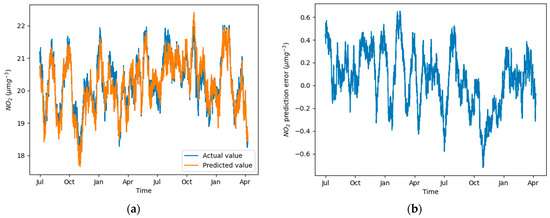 Test data NO2 concentration time series plots for Graz Nord. The plots present a 7-day moving average (for better visibility). (a) Actual values and the values predicted by the 1D CNN model; (b) 1D CNN model prediction error.