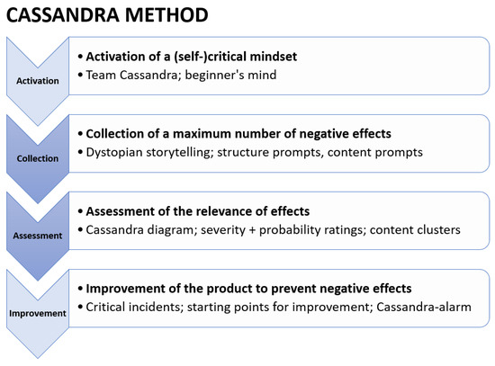 Based on the above considerations, a first central characteristic of the envisioned Cassandra method is the dystopian view and the deliberate focus on negative outcomes. This is meant as a complement to many design and creativity techniques, which instead promote an optimistic mindset and imagination of positive consequences, with some of these, such as classical brainstorming, even explicitly forbidding critiques in the first round. While this can be a valid approach for the phase of idea generation, it can become a problem in later phases of product development. Often, the concept as such is found to be valuable quickly, and the critical questioning rather refers to the technical feasibility or how to make a business case out of it. In addition to such structural aspects, psychological tendencies, such as group think [4], may play a role. As is known from social psychology research, people in a group setting typically fail to recognize risks or deficits and feel pressure to conform and maintain group cohesiveness. Thus, the group members reinforce each other in a biased overly optimistic view. Therefore, mainly positive future scenarios might be discussed within development teams, whereas possible negative effects are left out. In order to fill this gap, Cassandra explicitly looks for the related risks and systematically scans for possible negative developments. Psychologically speaking, one could say that Cassandra aims for the motivational state of a prevention rather than a promotion focus [5]. Note that Cassandra does not aim to make a final decision on whether a technology should be developed or not. In contrast to cost benefit analysis (e.g., [6,7]), it is not about balancing pros and cons or weighing the severity of envisioned benefits and drawbacks. This may follow in a subsequent development step, or, even better, Cassandra may inspire ideas as to how negative side effects could be prevented or alleviated by refining specific product features. However, for the moment of Cassandra, the positive does not play a role.