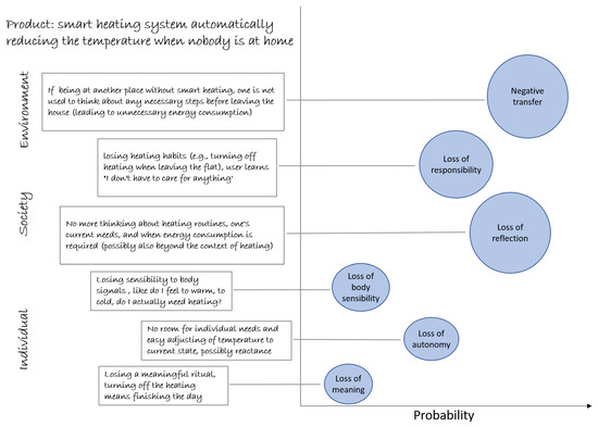 Cassandra diagram of negative effects for the example, a smart heating system that automatically reduces the temperature when nobody is at home, discussed in the expert workshop. Note: Circle size represents the severity of effects.