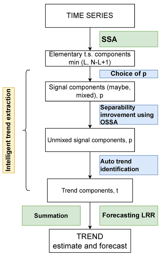 - Golyandina, N.; Dudnik, P.; Shlemov, A. Intelligent Identification of Trend Components in Singular Spectrum Analysis. Algorithms 2023, 16, 353. [Google Scholar] [CrossRef]
