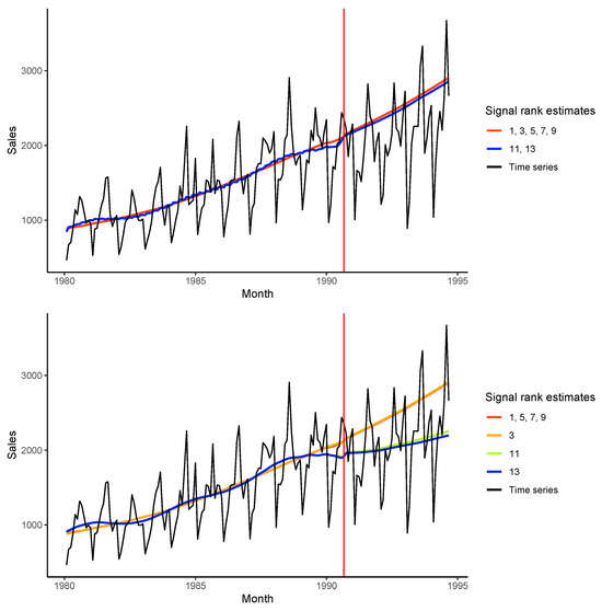 r yield distinct forecasts. The AutoEOSSA algorithm with improved separability can extract trend components from the components mixed with noise, whereas AutoSSA is not able to do this. Both methods select one component for reconstruction for estimated ranks less than 11 and two components for ranks 11, 12, 13 (we did not consider larger ranks). However, the second component in AutoSSA is only a small part of the trend due to mixing with seasonality. Note that for AutoSSA, the trend reconstructions and forecasts are the same for the same identified trend components. For AutoEOSSA, they may vary slightly due to different results of the separability improvement.