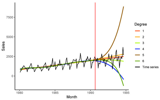 Figure 4 contains the forecasts provided by polynomial regressions. One can see that the results are unstable. The best accuracy corresponds to linear and cubic regressions.