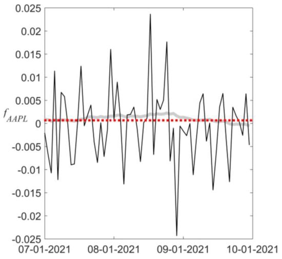 Estimation of fitness: instantaneous vs. smoothed fitness. Data corresponding to Apple (AAPL) for the second and third quarters of 2021. The rapidly varying black full line is the instantaneous fitness produced by Equation (6) for each day of the validation period. The thick gray line is the smoothed fitness, obtained through Equation (7) with a running time window of length TT = 63 days (the number of market days of a quarter); it shows much smaller variations and slightly departs from the constant fitness value (red-dotted line) used by the FSMC forecasting.