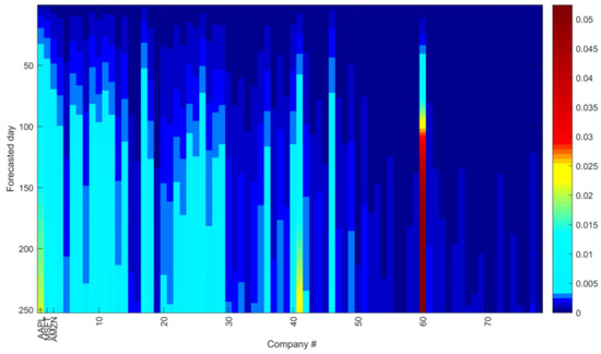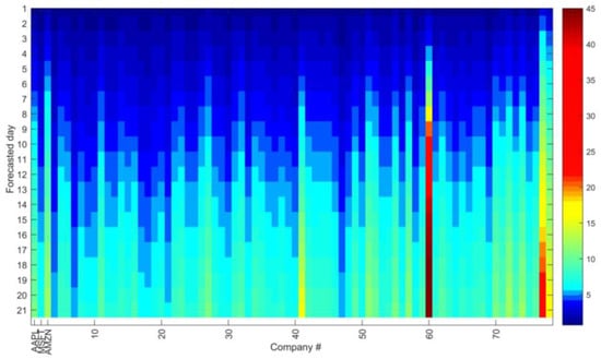 The absolute percentage errors yielded by the FSMC method for each firm over Tv = 21 days (a market month). Each of the 21 × 78 cells corresponds to the percentage error for the forecasted day and company number i averaged over the 5536 − 2TV = 5536 − 2 × 21 = 5494 validation instances (Equation (11)). The color code is as follows: blue indicates small average relative errors (<5%), while red corresponds to large relative errors (>20%).