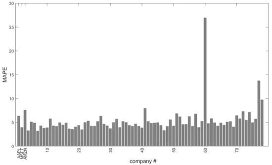 Likewise, as shown in Figure 4, the MAPEi (Equation (11)) over TV = 21 days for most of the companies is <5%, while only for two companies, AIG and Fannie Mae, it is >15%.