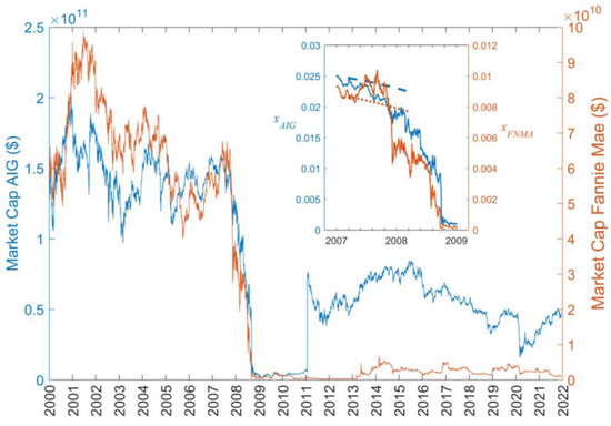 The evolution of the market caps of AIG and Fannie Mae from 2000 to 2021. The inset is zoomed in on the corresponding fractions of both companies (filled) and the FSMC predictions (dashed and dotted). $ corresponds to USD.