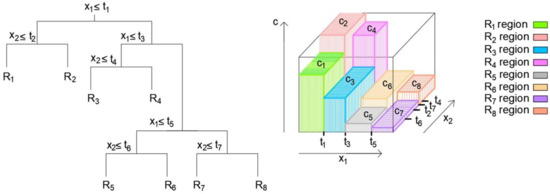 Let the dataset consist of p values of the input variable and one value of the output variable, for each of N observations, i.e., () where i = 1, 2, …, N, and . Within the tree formation algorithm, it is necessary to determine the variables (splitting variables) on which the splitting will be performed and the value (split points) on which the splitting will be performed.