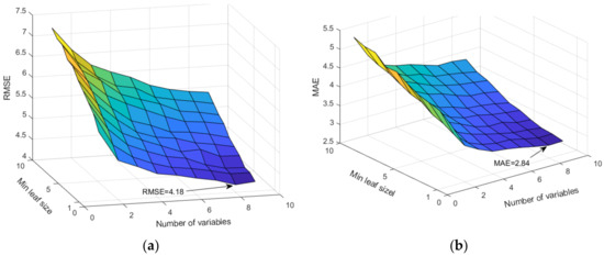 Regarding the defined criteria of accuracy in terms of RMSE and MAE, the Random Forest model with the following hyperparameters proved to be optimal: the number of ensemble trees equal to 500, the number of variables and tree splitting equal to 8, and the minimum number of data per terminal leaf (min leaf size) equal to 1. For MAPE and R values, the optimal TreeBagger model had the following hyperparameters: 500 trees in the ensemble, all variables considered for splitting, and a minimum of 1 data point per terminal leaf.