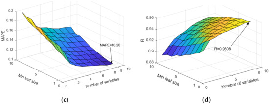 Assessment of the accuracy of RF and TB models based on the number of randomly selected splitting variables and minimum leaf size: (a) RMSE, (b) MAE, (c) MAPE, (d) R.