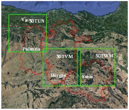 Study area: different tiles from Sentinel-2 Burgos (30TVM), Palencia (30TUN), and Soria (30TWM).