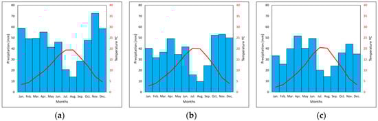 Climodiagrams of the study areas: (a) Burgos, (b) Palencia, and (c) Soria.