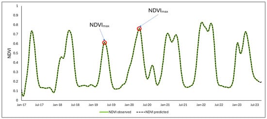 Figure 5 shows the observed NDVI time series and the time series predicted with the ARIMA model, emphasizing the maximum values of the NDVI for the campaigns studied.