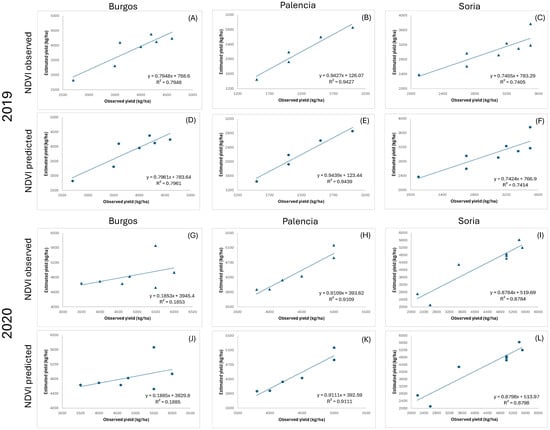 The observed and estimated yields (kg/ha) for 2019 in the provinces of Burgos (A,D), Palencia (B,E) and Soria (C,F) compared to the obtained and predicted NDVI also for 2020 in the provinces of: Burgos (G,J), Palencia (H,K) and Soria (I,L). The estimated yields were obtained from the multiple linear regression.