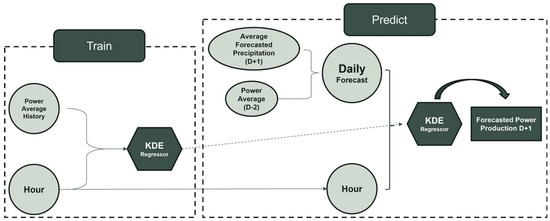 Finally, during the predicting/testing stage, the daily forecast for the prediction date (PD/D+1) is provided and the corresponding hours for outputting the hydro power value are specified. The KDE model interprets the historical daily average data and, using the daily forecast as an approximate estimation, predicts the hydro power value for each hour. The entire process of training and predicting is highlighted in Figure 1.