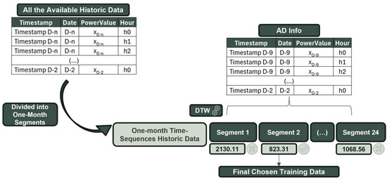 Utilizing this powerful tool, we aimed to use the DTW output value as our metric to select the best historical data for the specific available date (AD/D) on which we were to train our model and make predictions for the following day. The first step was to divide all the historical data into one-month time sequences, spaced out 2 weeks apart, totaling 24 time-sequences within one year of data. Next, acknowledging the potential limitations of daily data in adequately representing a specific period, we utilized data from the seven days leading up to two days before our forecast day as the reference time series information, or as we previously referred to it, our AD Info. This time sequence serves as our representation of the day we want to make predictions. Assuming some degree of stability across these days, we accepted the preceding seven days as the best means to characterize the information about our forecast day and, subsequently, the best way to identify the optimal training set. Finally, each of the one-month historical segments is evaluated against our AD Info using DTW as a metric, and the pair with the lowest DTW value is chosen as the optimal historical data training set.