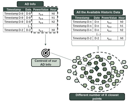 In contrast to the previous approach, the valuable information present in the AD Info could be translated into a centroid that summarized the days leading up to our forecasting day. Using Euclidean distance between this centroid and each point in the historical data, the n-nearest points closest to the centroid were identified. Subsequently, to optimize this process and determine the optimal length for our training history, this process was tested using different lengths, ranging from one to four months.