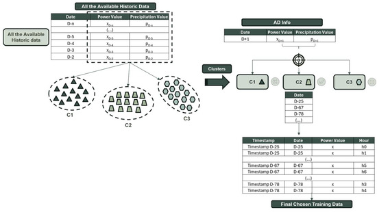 Although this approach is very similar in concept to K-means alike, it diverges from it in several ways. During the definition of our K-means space, instead of using the hourly or quarter-hourly hydro power values, we utilized tuples of daily average power combined with the daily average forecasted precipitation values. In contrast to what occurred using K-means alike, where each point represented one specific hour of one day, this time each point referred to a complete day. Furthermore, unlike the other approaches, this method does not incorporate the seven previous days leading to D-2; instead, it solely relies on the information from one day, specifically D-2. Because this method is based on the traditional algorithm of K-means, we wanted our AD Info (reference time series information) to be only one point in our 2D space. As depicted in Figure 4, our AD Info is only a tuple composed of the daily average power of D-2 and the daily average precipitation of D+1. Due to these two particularities, this method does not select points but instead selects days. This means that during this process, when we assigned our AD Info tuple to a cluster, we indicated that all the points from the days within that cluster would form our training set. This subtle distinction makes this method the only one that searches for typical days like our AD Info rather than for individual points associated with hours.