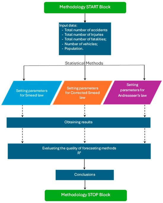 A pioneering and enduring principle in road safety research for the forecasting of fatalities is Smeed’s law [4], which elucidates the functional correlation between the fatality rate and the rate of motorization. Numerous authors have studied the applicability of Smeed’s law [5,6,7,8,9,10,11,12]. In 1980, John Adams re-evaluated Smeed’s law and determined that the total vehicle distance traveled (in vehicle-kilometers) provided a better indication of risk exposure [5]. A recent study discovered that Smeed’s formula accurately depicts the alteration in fatalities up to a motorization rate of 0.2–0.3 vehicles per person. However, beyond this threshold, the formula appears to overestimate the fatality rate [6].