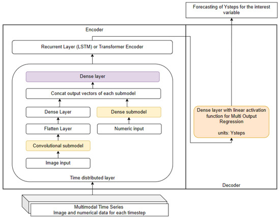 Schematic representation of the multimodal time series forecasting model, demonstrating the concatenation of submodels inside the time-distributed layer corresponding to each modality in the dataset. In this specific case, two modalities are utilized, namely images and numerical data.