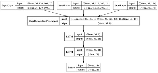 The core temporal analysis was conducted via a long short-term memory (LSTM) layer, which was specifically designed for the processing of sequential data. The unified feature vector for each time step was fed into the LSTM, allowing it to learn and retain information across the entire temporal window, employing a time-distributed Layer as shown in Figure 3.