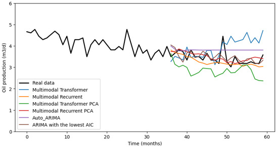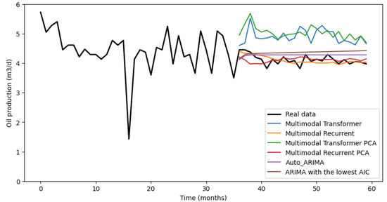 Table 2 displays the results of the tests conducted across 10 oil wells. These results are quantified in terms of MAPE (mean absolute percentage error), as shown in Equation (1). The findings indicate that the multimodal model exhibited the most favorable performance, with a mean absolute percentage error of 8.2%. Nevertheless, it is noteworthy that the ARIMA model with the lowest AIC outperformed the multimodal model in some specific cases.