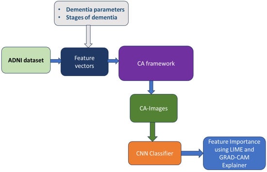 The block diagram of the convolutional neural network (CNN) classification for the obtained CA patterns obtained from the ADNI dataset has been shown in Figure 4. The redistributed CA images have been divided into 70% as training data (i.e., 350 healthy and 350 unhealthy) and 30% as testing data, i.e., 150 healthy and 150 unhealthy. The deep learning architecture constituting two layers of Conv2d has been modeled to classify the CA images with and without cognitive impairment and then connected to flattened and dense layers, which produces prediction and classification of the images. Hyperparameters, such as filters and kernel sizes, have been used to optimize a CNN model’s performance to learn relevant features from input data. The Adam optimizer with 35 epochs and sparse categorical cross entropy was used for hyper-tuning the parameters. The explainability and interpretability of features for the CA images have been obtained from GRAD-CAM and LIME explainers.