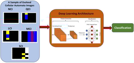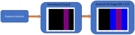 A cellular automata (CA) approach has been employed for classification problems. Cellular automata are discrete and abstract computational systems that allow simulations of spatially distributed phenomena and their dynamics over time. It has proved beneficial as a general complexity model and a more specific representation of non-linear dynamics []. CAs are used in modeling biological systems, such as virus evolution, gene mutation, kidney models, heart dynamics, brain dynamics, and the spread of disease [,]. CA is composed of a cell grid. Each cell in the grid can be in one of a predefined set of feature values, and computation is carried out by updating the state values using a diffused rule. These rules are defined based on the interaction of neighbor cells [,]. A CA framework has been utilized in the algorithm to warm the automata cells. The obtained characteristic heat map for the classes in the data has been classified using machine learning models [,].