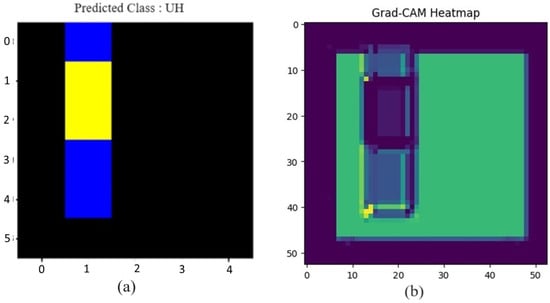 Predicted class and GRAD-CAM explainer for a sample CA image. (a) Class predicted as unhealthy for CA image from CNN classifier. Feature 1 (orientation) and feature 2 (judgment) play high importance, represented in yellow, whereas features 0 (memory), feature 3 (community affairs), and feature 4 (hobbies) play low importance, represented in blue. (b) GRAD-CAM image explanation for low cognitive impairment CA image based on the color intensity is high for orientation and judgment features.